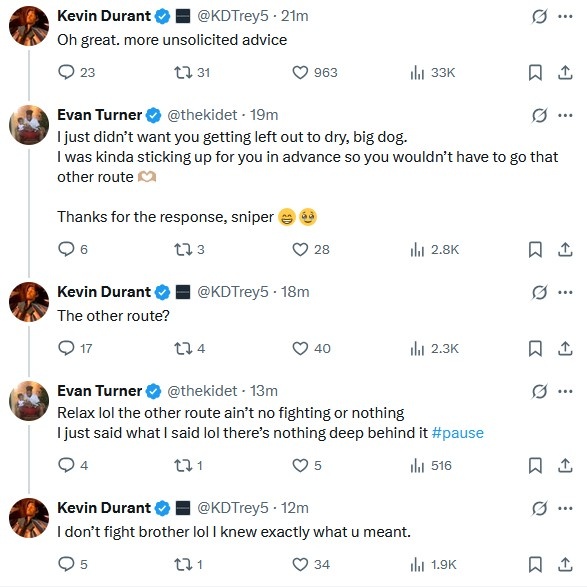 比赛中阿门和阿尔瓦拉多爆发肢体冲突,前NBA球员埃文-特纳在网上展开评论,不料杜兰特提着键盘前来维护队友,双方展开了一轮对线。具体内容如下: