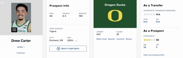 除了TK之外,另一个后卫是德鲁-卡特,他其实是纯二号位,高中的时候预测三星(采访的时候很多人会提到他,对他有期望和滤镜),但进大学以后打得不好,已经大四了——我觉得他的机会可能不大(打夏威夷出场时间比林葳更多,但数据一样都是0)