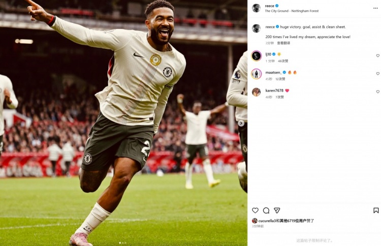 本场比赛里斯-詹姆斯迎来球队生涯200场里程碑,并且传射建功。他在赛后社媒晒照写道:“一场大胜,并且取得进球和助攻,完成零封,200次出场实现梦想,感谢大家的爱!”