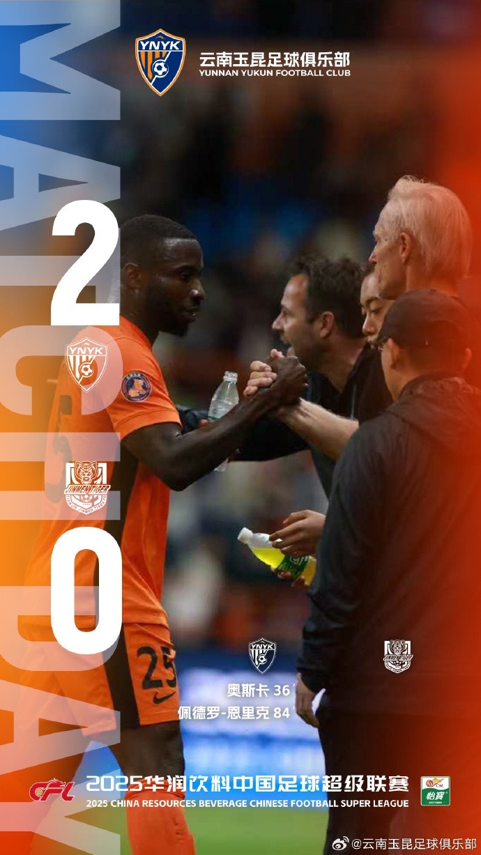 2025华润资料中超联赛第27轮,凭借奥斯卡与恩里克的进球,云南玉昆以2比0击败对手,完成对天津津门虎赛季双杀。上半场比赛,对手禁区内手球犯规,主裁判吹罚点球,奥斯卡操刀主罚命中,将个人中超赛季进球纪录刷新到9个。下半场,替补出场的恩里克接约尼查的角球助攻破门。