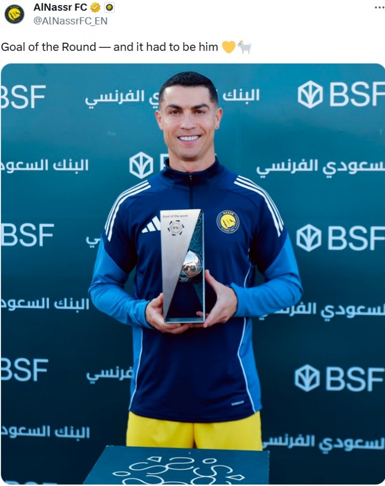 2025-11-09 00:03:39梅开二度助队取胜,C罗赛前领取上轮沙特联最佳进球奖杯