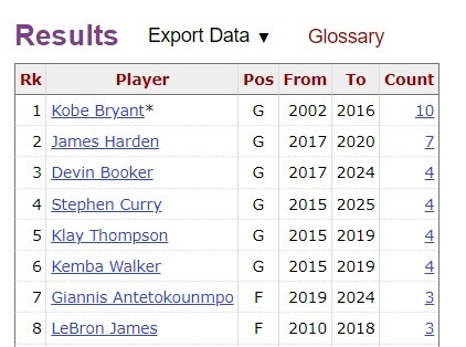 1996-97赛季至今,至少3次半场35+(上下半场都算)的球员一共有8人,分别是科比、布克、库里、克莱、肯巴·沃克、字母哥和詹姆斯。